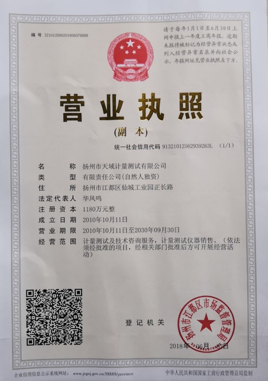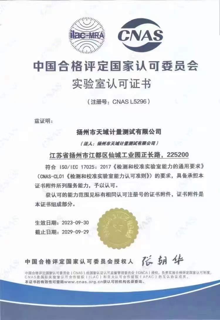 揚州市天域計量測試有限公司,坐落在交通便利的揚州市江都區(qū)仙城工業(yè)園,成立于2010年10月,2011年11月正式獲取中國合格評定國家認可委員會認可(授權),注冊號:CNAS L5296。近幾年的發(fā)展,實驗室已具備了較大規(guī)模,并形成了集計量器具檢測,計量技術咨詢和計量器具銷售為一體的專業(yè)化技術機構,客戶覆蓋蘇南、蘇北、和浙江,安徽部分地區(qū),客戶群總量達到了上千家企事業(yè)單位。實驗室建立健全了一套較為完整的內(nèi)外部質(zhì)量管理體系,至今未發(fā)生糾紛和客戶投訴事件。